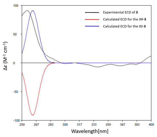 The absolute configuration of C-9 in compound 3 was deduced by the calculated ECD spectra. The theoretical calculated electronic circular dichroism spectra were performed using TDDFT (time-dependent density functional theory). The optimized conformation of the model was obtained and further used for the ECD calculation at the B3LYP/6-31G (+d) level. The overall pattern of the experimental ECD spectrum was in reasonable agreement with the calculated ECD spectra (Figure 4). Thus, the absolute configuration of 3 was established as 9S.