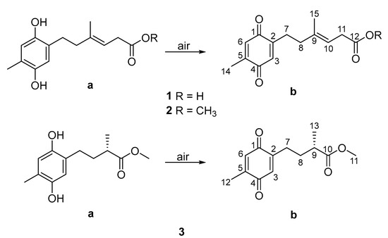 Dihydroquinones can sometimes be converted to quinones by oxidative transformation. For instance, the natural p-dihydroquinones [11], and fallahydroquinone [12], isolated from the Western Australian brown alga Cystophora sp., and the southern Australian brown alga Sargassum fallax, respectively, were discovered to be the results of rapid air mediated oxidation on the (2′E)-2-(3′,7′-dimethylocta-2′,6′-dienyl)-6-methyl-2,5-cyclohexadiene-1,4-dione moiety. With regard to compounds ketidocillinones A–C, after exposure to air for about one week, these pure compounds were transformed into mixtures of both enol/keto form structures (Figure 5) with the ratios (enol:keto) 1:1 for 1 (Figure S32), 2:1 for 2 (Figure S39), and 5:4 for 3 (Figure S46), which again proved the non-enzymatic oxidation transformation from dihydroquinones to quinones in natural products. To classify the results, we also collected the NMR data of the mixture of enol/keto forms of 1–3 (Table 2 and Table 3, Figures S32–S51).