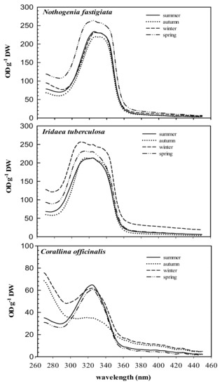 - Velasco-Charpentier, C.; Pizarro-Mora, F.; Navarro, N.P. Variación en la concentración de aminoácidos tipo micosporinas en macroalgas de las regiones de Valparaíso y Magallanes, Chile. Rev. Biol. Mar. Oceanogr. 2016, 51, 703–708. [Google Scholar] [CrossRef]