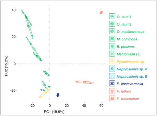 To investigate metabolome diversity in 12 divergent algae, an untargeted holistic approach was chosen to cover a broad range of metabolites, such as lipids or pigments known as algal biomarkers. Algal ethyl acetate extracts were analyzed by UHPLC-ESI+-HRMS2, and acquired ion chromatograms were processed through an untargeted metabolomic workflow in Compound Discoverer 2.1 software (Thermo Scientific) to generate extracted ion chromatograms across samples, detect and quantify corresponding metabolites, and generate the observations/variables matrix used for further statistical analyses. As a first observation, 2565 ions were detected across all samples, and 1143 ions were unique features detected in only one species. Moreover, detected features ranged from 867 ions in O. tauri sp. 1 to 241 ions in Pyramimonas sp. 1422 ions are shared between at least two species (Figure S1). These observations suggest high variation in the diversity of produced metabolites. To display this variation, an initial principal component analysis (PCA) was conducted on the observations/variables matrix to compare metabolomic profiles between strains at the global metabolome scale (Figure 1). Principal Components (PCs) 1 and 2 describe 34.8% of the variation, and the first PC separates Mamiellales from the two microalgae P. lutheri (Haptophyta lineage) and P. tricornutum (Stramenopile lineage), hereafter considered outlier microalgae as they are not part of the green lineage. The second PC separates Ostreococcus species from other Chlorophytes (Nephroselmis, Pyramimonas). Interestingly, intraspecific metabolome diversity seems minimal as compared to within-replicate variation, as the two O. tauri strains’ PCA confidence ellipses overlap.