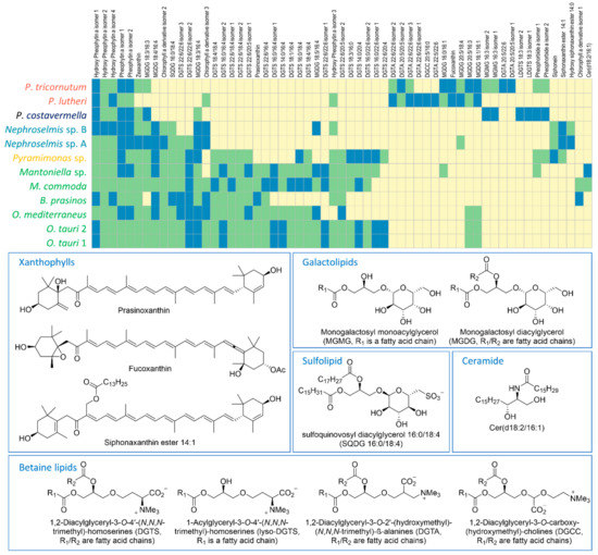 The most abundant and diversified metabolites identified over the 12 strains were polar lipids and pigments. These observations are consistent with an increasing number of studies concerning the analysis of algal lipidomes [28,33] and provide new lipidome information for the strains Mantoniella sp., Nephroselmis sp., and Pyramimonas sp. recently isolated from environmental samples. Further phylogenetic signals of metabolites are given and discussed in the following section.