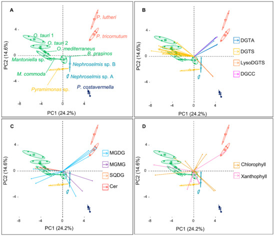 (A) Principal component analysis (PCA) constructed from the 59 most abundant metabolites matrix over the 12 microalgal strains, and the corresponding biplots of the (B) betaine lipids, (C) galacto-, sulfolipids, and ceramide, and (D) pigments (each arrow corresponds to a metabolite). Confidence ellipses cover 95% of group position estimation. Arrow coordinates correspond to the contributions of metabolites to the PC and color to the metabolite class. Arrows point toward the strains where they are the most represented.