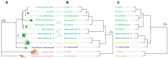 Phytoplanktonic eukaryotes are phylogenetically highly diverse, as they have many representatives in most super-groups of the eukaryotic tree of life [1,2]. The Archaeplastida super-group, or green lineage [3], includes all of the species that have descended from a primary endosymbiosis event, when an ancestral eukaryotic cell engulfed a photosynthetic prokaryote, that eventually evolved into an organelle, the chloroplast [4]. Our knowledge on the diversity of phytoplanktonic green microalgae has greatly increased with the democratization of DNA sequencing and genomics, but it is likely to stay behind that of their terrestrial relatives, including land plants, whose estimated species number exceeds 400,000 [5]. This is not surprising since unicellular organisms are generally less studied than multicellular organisms, and because bona fide species identification relies on tedious sampling and isolation steps which have yet to be performed for many marine microalgae. Recently, DNA sequencing of numerous environmental marine water sample extracts collected worldwide during the Ocean Sampling Day initiative provided evidence that many of the sequences detected belong to species from the green lineage that have no representative strains in culture [6]. This study also demonstrated the very broad geographic distribution of species from the class Mamiellophyceae, that dominates the picoeukaryotic fraction (cell diameter <3 µm) [7] in many coastal areas and thus plays a key ecological role in marine food webs. These picoalgae exemplify the ecological success of miniaturized eukaryotic cells [8] displaying a simple cellular organization (one mitochondrion and one chloroplast) and high surface–volume ratio, which is likely to confer advantages in nutrient-poor environments [9]. The Mamiellophyceae lineage is ancient, probably over 350 million years old [10], and currently comprises 22 described species [11]. Species from the three genera Bathycoccus, Micromonas, and Ostreococcus are particularly prevalent in the marine environment [6].