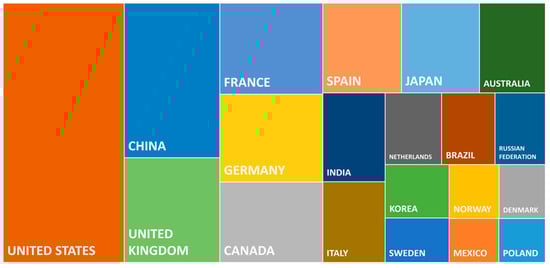 Top 20 countries publishing research about microalgae and phytoplankton. The square size represents graphically the number of publications by country.