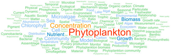 Figure 3 presents the main common concepts appearing in scientific publications at the world, European. and European AA levels. Overall, research concepts were the same at these three levels and correspond to environmental concepts such as phytoplankton, community, bloom, diatoms, distribution, ecosystem, coastal, chlorophyll, zooplankton, photosynthesis, and primary production. This environment/phytoplankton research domain can be differentiated from the microalgae/high-added-value molecules field that contained less and more recent publications, as previously reported [4].