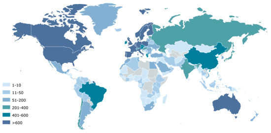 Figure 4 shows the network of worldwide collaborators by highlighting co-authorship of scientific publications with European authors in the field of microalgae and phytoplankton. The main collaborating countries of the European Union, with more than 600 joint scientific publications, are the U.S. (2668), Canada (877), Norway (735), and Australia (651). In addition, 400 to 600 scientific publications have been published in collaboration with China (562) and Brazil (452). Smaller collaborations leading to 200 to 400 joint publications with Europe have been listed for Russia (303), Japan (287), Chile (250), and India (203). Finally, collaborators having published between 50 and 200 scientific publications with Europe are Argentina (198), Mexico (198), New Zealand (186), Israel (161), South Africa (154), South Korea (118), Denmark (including Greenland) (105), Saudi Arabia (90), and Uruguay (67).
