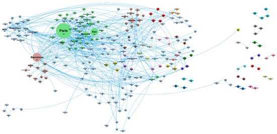 Figure 14 and Table 6 show the main AA cities identified as scientific collaborators in the microalgae European AA publications. With 707 publications, Southampton is the city with the highest number of publications in the AA, followed by Vigo, Plouzané, Lisbon, Brest, Nantes, and Plymouth as the most productive AA cities, with more than 500 publications each. Paris is the first city outside the AA to publish the most publications with AA co-authors (375 publications). The network of all these collaborations is shown in Figure 15.