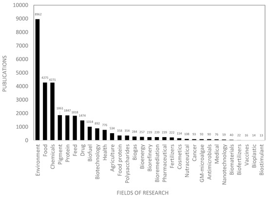 Figure 2 presents the top 20 publishing countries in the field of microalgae and phytoplankton. The two main publishing countries are the United States (U.S.) and China, with 18,269 and 8601 publications, respectively. These results are in line with the data published by Garrido-Cardenas et al. (2018). The U.S. researchers are the most represented authors or co-authors in microalgae scientific publications worldwide. In total, 2368 publications involved the U.S. and European authors and 836 publications involved U.S. and European Atlantic authors.