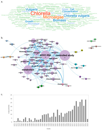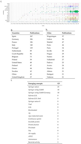 Following the identification of the top 15 microalgae genera studied in Europe, a detailed study of associated and emerging concepts, scientific consortia working on these genera in Europe, research cities, temporal evolution of publications by country, top journals, citations, and top cited papers was performed. The results of this advanced analysis are presented below for Chlorella sp. in Figure 8 and equivalent figures for the 14 remaining genera are presented in the Supplementary Materials section in Figures S1–S14.