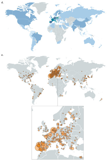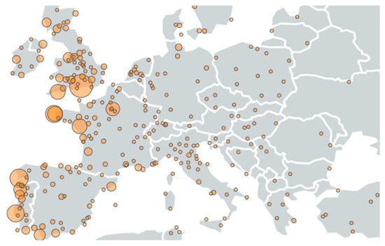 Figure 5 shows the collaboration networks existing between European cities involved in scientific publications produced in the European Union in the field of microalgae and phytoplankton. These networks highlight national and regional geographic clusters such as those of Wageningen, Lisboa, Helsinki, or Vigo. This figure also provides an overview of strong collaborations in Europe and highlights the lack of collaboration between some cities, suggesting potential opportunities for new collaborations.