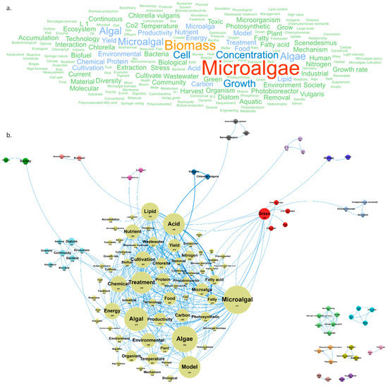 Main concepts (a) and concepts network (b) in 1882 AA publications published since 2017 related to high-added value microalgae molecules (400 links; 44 co-occurrences; 45 occurrences; 18 clusters).