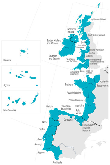 The European AA, as defined in the InterReg AA research program. This area, identified in blue on the map, includes administrative regions bordering the Atlantic Ocean in Portugal, Spain, France, the United Kingdom, and Ireland.