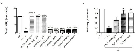 To evaluate the effect of hydrolysates on cell viability, RAW 264.7 cells were incubated with increasing concentrations of APH: 0.01–0.05–0.1–0.5–1–10–50–100 mg/mL. After 24 h of incubation, hydrolysates at the concentration of 0.01, 0.05, 0.1 mg/mL showed a viability almost comparable to control group (95%) while the higher concentrations were inxic (20%) (Figure 1).