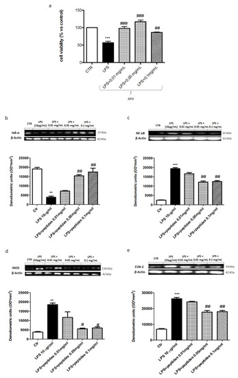 Effect of APH on inflammatory pathway on macrophages RAW 264.7. The incubation of cells with LPS significantly reduced cell viability compared to the control group, whereas pretreatment with APH at the concentrations of 0.01, 0.05 and 0.1 mg/mL significantly limited the reduction of cell viability (a). Western blot analysis for Ikb-α and NFκb demonstrated a significant decreased of Ikb-α and an increasing of NFκb following LPS stimulation (b,c, respectively). The pre-treatments with 0.05 and 0.1 mg/mL significantly decreased the cytosolic degradation of Ikb-α and reduced the nuclear traslocation of NFκb, respectively (b,c). The levels of iNOS and Cox2 were also reduced with APH treatment at concentrations of 0.05 and 0.1 mg/mL, respectively (d,e). Data are representative of at least three independent experiments. # p < 0.05; ## p < 0.01; ### p < 0.001 vs. LPS; ** p < 0.01; *** p < 0.001 vs. Ctr.