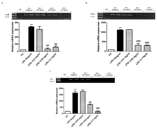 Effect of APH on cytokines mRNA expression on macrophages RAW 264.7. The expression of the pro-inflammatory cytokines TNF-α, IL-1β and IL-6 were evaluated by RT-PCR (a,b,c). A significant decrease in IL-1β (230 bp), TNF-α (212 bp) and IL-6 (159 bp) mRNA expression following LPS stimulation was evident. Moreover, the concentrations of 0.05 and 0.1 mg/mL decreased cytokine mRNA levels significantly. Data are representative of at least three independent experiments. ## p < 0.01; ### p < 0.001 vs. LPS; *** p < 0.01 vs. Ctr.
