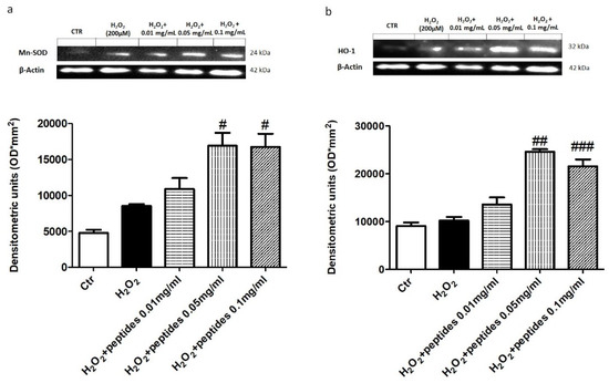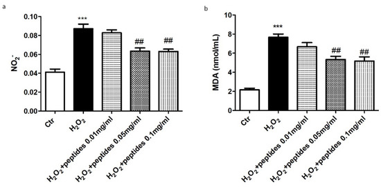 To evaluate the effect of hydrolysates on oxidative stress, we evaluated the expression of the antioxidant enzymes MnSOD and HO-1 by western blot analysis. A marked decrease in both MnSOD and HO-1 expression was evident following H2O2 stimulation (Figure 4). Interestingly, treatment with hydrolysates at 0.05 and 0.1 mg/mL up-regulated MnSOD and HO-1 expression comparable to control group. As a marker of oxidative response, we investigated the total nitric oxide (NO) production in the supernatants of cells. Notably, 10 min following H2O2 stimulation, total NO levels were significantly higher compared to the control group. The pre-treatment with hydrolysates at 0.05 and 0.1 mg/mL considerably reduced total NO levels (Figure 5a). Moreover, we investigated the effect of hydrolysates on lipid peroxidation by MDA assay. Following H2O2 stimulation, MDA levels in the cell lysates were significantly increased. Lipid peroxidation was significantly attenuated by the pre-treatment with APH at 0.05 and 0.1 mg/mL (Figure 5b).