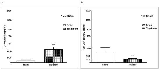 Granulocyte macrophage colony-stimulating factor (GM-CSF, Csf2) is a growth factor for myeloid-lineage cells that has been implicated in the pathogenesis of atherosclerosis and other chronic inflammatory diseases. Thus, we evaluate by Elisa kit the level of GM-CSF on plasma collected via retro-orbital blood samples from mice ApoE KO. Our results showed a significant decrease in GM-CSF levels following the treatment with hydrolysates in ApoE KO mice (Figure 6a). Interleukin (IL)-10 in macrophages and T cells is involved in the modulation of several cellular processes that may interfere with the development and stability of the atherosclerotic plaque. Our data showed a substantial increasing in IL-10 in ApoE KO mice following hydrolysates treatment, demonstrating its protective role (Figure 6b).