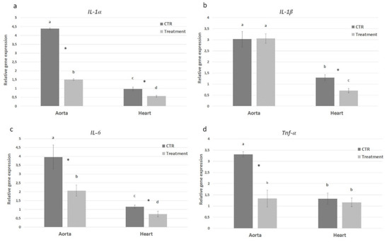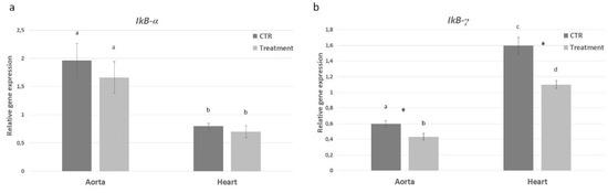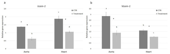The levels of IL-1α, IL-1β and IL-6 gene expression in heart and aorta tissues were evaluated from both control and treatment groups in order to assess the effect of hydrolysates on the inflammatory pathway. In the PH-treated mice a significant decrease of IL-1α mRNA level was observed in aorta (2.9 times) with respect to control group. A decreased difference, but still significant, was observed in heart tissue (1.7 times) (Figure 7a). On the contrary, the IL-1β gene expression was comparable in aorta from both experimental groups; in the heart, instead, IL-1β was down-regulated in the treated group with a difference of 1.8 times (Figure 7b). The mRNA level of IL-6 showed a pattern of expression similar to IL-1α with significantly decreased expression in heart (1.54 times) and aorta (1.98 times) from APH-treated group (Figure 7c). Moreover, the NFk-B pathway was investigated to evaluate its possible involvement in the anti-inflammatory response exerted by the anchovy protein hydrolysates. TNF-α gene expression was down-regulated in aorta from treated mice (2.5 times); no difference in heart tissue was observed between experimental groups (Figure 7d). IKB-α gene expression was comparable in aorta and heart between control and treatment groups (Figure 8a). On the contrary the IKB-γ gene expression was down-regulated in both aorta and heart from treated mice (Figure 8b). Inflammatory markers Icam and Vcam were also investigated showing a decrease in mRNA level in both aorta and heart tissues from APH-treated mice, thus suggesting that anchovy protein hydrolysates exert an anti-inflammatory activity in ApoE KO mice (Figure 9).
