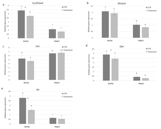 Cu/ZnSod, MnSod, Gpx, Cat and Ho mRNA expression levels were evaluated in both heart and aorta from control and APH-treated mice to assess the possible antioxidative role of anchovy protein hydrolysates. Gene expression analysis revealed that most of the antioxidative markers were modulated by the supplementation of protein hydrolysates in the diet, although at different levels (Figure 10). Only Cat expression did not show differences in heart and aorta from both experimental groups. Although mRNA expression level of Cu/ZnSod, MnSod, Gpx and Ho decreased in heart compared to aorta tissue, the treatment with protein hydrolysates induced a down regulation of superoxide dismutases: Cu/ZnSod expression was significantly decreased in aorta (1.24 times) from treated mice (Figure 10a); MnSod expression decreased 1.1 fold in aorta and 1.24 in heart from treated mice although this difference was not significant (Figure 10b). Similar expression patterns for Gpx and Ho mRNA levels were observed, with a significant difference in aorta Ho and Gpx levels where the treatment with protein hydrolysates induced a 1.87- and 1.19-times decrement in the gene expression, respectively (Figure 10c–e). The obtained results show that protein hydrolysates from anchovy are able to modulate the oxidative response and play an antioxidative role in ApoE KO mice.