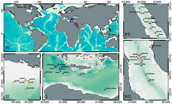 Global distribution of deep hypersaline anoxic basins (DHABs) (a). Locations and corresponding names of DHABs identified in the Red Sea (b1–b2), the Gulf of Mexico (c), and the Mediterranean Sea (d).