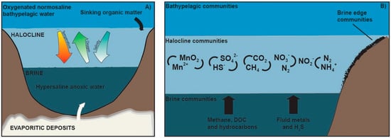 Despite the different geological features found in DHABs, most of them are derived from the re-dissolution of evaporitic minerals, like halite (NaCl-mineral) and kieserite (MgSO4-mineral), after exposition to seawater due to tectonic activity [25,26]. This determines a salt-induced stratification of the water column (Figure 2), which drives the formation of a stable, dense, hypersaline brine lake with a variable thickness, ranging from one to tens of meters; this brine lake represents a polyextreme environment because its conditions hinder oxygen exchange, creating euxinic conditions, including high hydrostatic pressure, extremely low water activity and chaotropicity, and sharp oxy-, picno-, and chemoclines at the seawater–brine interface [21,23,27]. The salt concentration progressively increases over depth in the overlying halocline interface, reaching brines values up to 7–10 times higher than those existing in seawater [28].