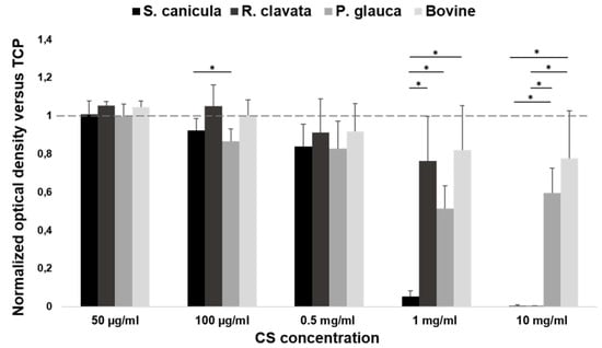 The viability of the osteoblastic-like cell line MG-63 exposed to different concentrations of CS (50 µg/mL to 10 mg/mL) supplemented to the cellular growth medium is depicted in Figure 1. Absorbance results were normalized against cells cultured on CS-free (growth medium) condition. The dotted line represents a ratio of 1, which indicates the same cellular viability as in CS-free. After 72 h incubation, results revealed an absence of cytotoxicity for CS concentrations below 0.5 mg/mL. Given that, 0.5 mg/mL could be considered as a threshold concentration of CS for MG-63 cell line, as cellular viability is guaranteed for equal and lower concentrations. Higher doses revealed values close to zero for S. canicula and R. clavata CS, with normalized values significantly lower regarding CS-free viability, which presented mean values below the dotted line and high variability between replicates for the same CS. At 0.5 mg/mL CS concentrations, cell viability presented similar values for all CS sources and the mean values were below the dotted line. It is at the concentration of 100 µg/mL, where optical density of CS obtained from R. clavata overcomes the dotted line and, therefore, favors MG-63 cell viability in relation to CS-free conditions. This effect was significantly higher (p < 0.05) than the viability obtained for P. glauca CS, and superior to S. canicula and bovine CS. Finally, the lowest concentration (50 µg/mL) revealed benefit in mean value of CS from R. clavata and bovine CS, in comparison to CS-free, and the same viability observed for P. glauca and S. canicula CS, but no statistical significant improvement was found, for any of the tested sources at this concentration.