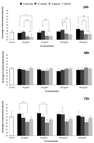 T/C-28a2 chondrocytic cell line viability and proliferation (directly proportional to alamar blue dye reduction) after 24, 48 and 72 h incubation in basal medium (Dulbecco’s modified Eagle’s medium (DMEM) 10%) supplemented with different concentrations of CS (10 µg/mL, 50 µg/mL, 100 µg/mL and 200 µg/mL) or CS-free, derived from fish (Prionace glauca, Raja clavata and Scyliorhinus canicula) and bovine sources. Significant statistical differences for p < 0.05 (*) and p < 0.01 (**) are shown. No significant differences were found amongst the different CS sources and CS-free condition.