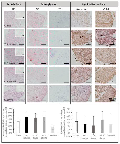 Histological analysis for morphology (haematoxylin and eosin, HE), proteoglycans (toluidine blue, TB) and sulfated glycosaminoglycans (GAGs) synthesis (safranin-O, SO), and immunolocalization of collagen-type II (Col-II) and aggrecan (scale bar = 200 µm), was performed in osteoarthritic bone marrow mesenchymal stromal cells (BM-MSCs) pellets, after 14 days, in chondrogenic medium supplemented with 100 µg/mL CS extracted from fish (Prionace glauca, Raja clavata and Scyliorhinus canicula) and bovine sources or CS-free. Immunopositive aggrecan (bottom, left) and collagen type-II (bottom, right) percentage area were normalized against cell-pellets total area (n = 3).