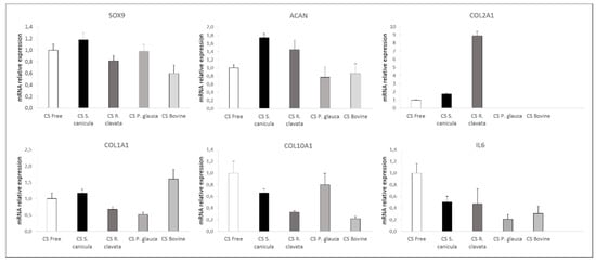 We then investigated the effect of CS in chondrogenesis, by culturing bone marrow mesenchymal stromal cells (BM-MSCs), in a three-dimensional pellet conventional culture system, in chondrogenic medium stimulated with TGB-β3 and supplemented with 100 µg/mL CS from the different sources, during 14 days. When analyzing cell-pellets’ gross appearance, MSCs supplemented with S. canicula and bovine CS induced the formation of smaller sized pellets (Figure 3, small top HE). Chondrogenic differentiation was evaluated by analyzing the expression of genes (Figure 4) related to hyaline-like cartilage (SOX9, ACAN and COL2A1), fibrocartilage (COL1A1), hypertrophy (COL10A1) and inflammation (IL6) and the production of a sulfated-GAG- and proteoglycans-containing pellet matrix, by safranin-O and toluidine blue stainings (Figure 3). Conventional chondrogenic model condition (CS-free) led as expected to the expression of SOX9, ACAN, COL2A1. As reported in other models using bone marrow-derived MSCs [], an inevitable transient tissue is formed, as observed by the expression of COL10A1.