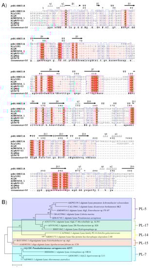 - Zeng, J.; An, D.; Jiao, C.; Xiao, Q.; Weng, H.; Yang, Q.; Xiao, A. Cloning, expression, and characterization of a new pH- and heat-stable alginate lyase from Pseudoalteromonas carrageenovora ASY5. J. Food Biochem. 2019, 43, e12886. [Google Scholar] [CrossRef]