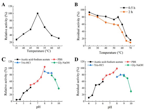 Effects of pH and temperature on the activity and stability of Aly1281. (A) Optimal temperature: Aly1281 activities were determined at various temperatures (35–65 °C). (B) Thermal stability: The residual activities of Aly1281 were determined after incubation at various temperatures (0–70 °C) for 30 min or 2 h. Relative activity is expressed as a percentage of maximum activity under the experimental conditions. (C) pH optima: Aly1281 activities were determined in the acetic acid-sodium acetate buffer (pH 4.0–6.0), Na2HPO4–NaH2PO4 buffer (pH 6.0–8.0), Tris–HCl buffer (8.0–9.0), and Gly–NaOH buffer (pH 9.0–10.0). (D) pH stability: The residual activities of Aly1281 were measured after the enzyme was incubated in the pH range of 4.0 to 10.0 with the above buffers for 24 h at 4 °C. Data represent the mean ± standard deviation of triplicate measurements.