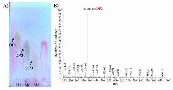 (A) TLC analysis of the hydrolysis products of Aly1281 with alginate sodium. Lanes 1–3 refer to the DP1–3 standards. (B) ESI-MS analysis of the hydrolysis products of Aly1281with alginate sodium.
