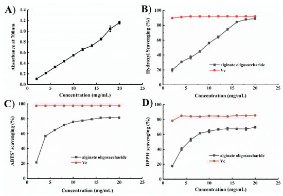 Antioxidant function of alginate oligosaccharides. (A) Reducing ability. (B) Scavenging effect on hydroxyl radicals. (C) Scavenging effect on ABTS radicals. (D) Scavenging effect on DPPH radicals. Data represent the mean ± standard deviation of triplicate measurements.