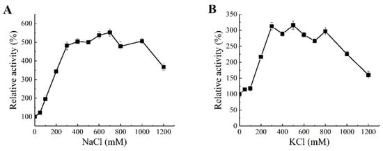 Due to the unique properties of the marine environment where the sourced bacteria are reproduced and evolve, enzymes extracted from marine bacteria often exhibit interesting enzymatic properties, such as salt tolerance and salt activation. The concentration effects of salts including NaCl and KCl on the enzyme activity of Aly1281 are shown in Figure 6. The enzyme activity of Aly1281 peaked after addition of 700 mM NaCl and 300 mM KCl, which, respectively, increased the activity of the lyase by 4.56- and 2.77-fold compared with that without salt addition. Aly1281 activity increased sharply with addition of NaCl and KCl at concentrations lower than 300 mM. Addition of excess NaCl and KCl at concentrations higher than 300 mM showed limited influence on enzyme activity. Moreover, addition of over 1000 mM salt reduced enzyme activity levels to a greater extent compared with that obtained after addition of salt at low concentrations. These results indicate that the proper amount of salt could greatly promote Aly1281 activity. The catalytic efficiency of Aly1281 was highly activated by salt concentrations similar to the average salt concentration in the ocean (ca. 430 mM). Thus, Aly1281 could be applied in the industrial enzymatic processing of brown seaweed without water-intensive desalting [46].