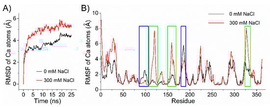 (A) RMSDs of alpha carbon atoms in 25 ns MD simulations as a function of time relative to the initial structure of Aly1281. (B) RMSFs of the alpha carbon atoms in 25 ns MD simulations of Aly1281. Blue and green boxes indicate protein domains that are highly stabilized or flexibilized by the addition of salt.