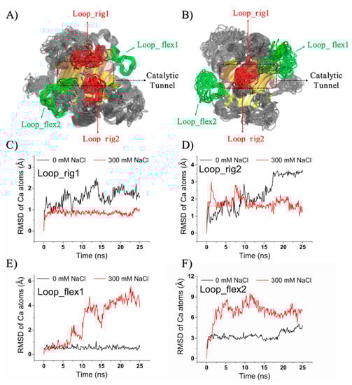 Conformational dynamics of Aly1281 in 25 sequential frames extracted from 25 ns MD trajectories with (A) 0 and (B) 300 mM NaCl. Catalytic tunnel-forming β-sheets are shown in yellow. The catalytic residues Q173, H175, and Y315 are shown as blue sticks. Two highly stabilized regions, namely, Loop_Rig1 and Loop_Rig2, are depicted in red, and two highly flexibilized regions, namely, Loop_Flex1 and Loop_Flex2, are displayed in green. RMSDs of the alpha carbon atoms of (C) Loop_Rig1, (D) Loop_Rig2, (E) Loop_Flex1, and (F) Loop_Flex2 in 0 and 300 mM NaCl refer to the initial energy-minimized structures.