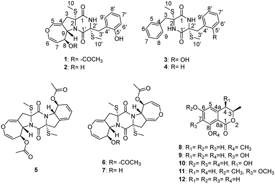 During our ongoing research for novel bioactive secondary metabolites from marine-derived Aspergillus species, we found a series of bioactive natural products with antifungal, antibacterial, antiviral, antifouling, and cytotoxic activities [12]. In the present study, the chemical investigation of the ethyl acetate (EtOAc) extract of Aspergillus terreus RA2905, isolated from the fresh inner tissue of the sea hare Aplysia pulmonica, resulted in the identification of two new thiodiketopiperazines, emestrins L (1) and M (2), as well as five known analogues (3–7), and five known dihydroisocoumarins (8–12) (Figure 1). Herein, we report the isolation, structural determination, and bioactivity evaluation of these compounds.