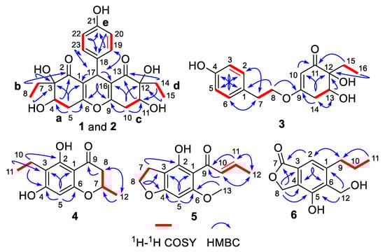 1H–1H COSY and key HMBC correlations of 1–6.
