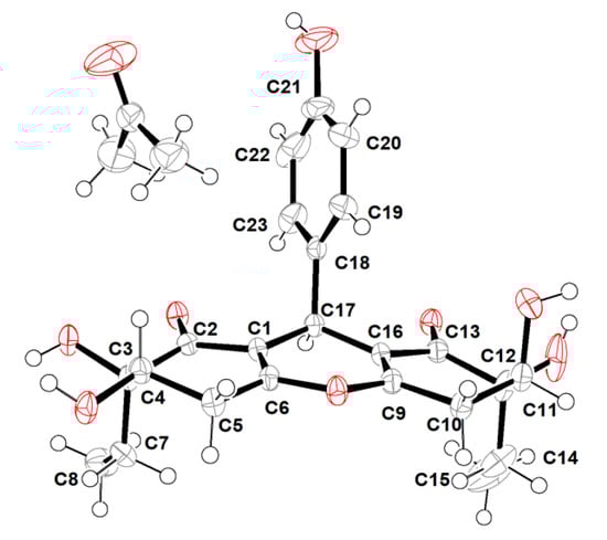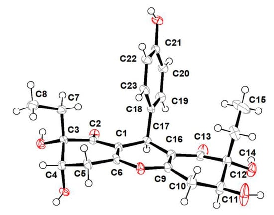 However, the high overlap of critical proton signals for H-4 and H-11, H2-7 and H2-14, H2-5, and H2-10, in conjunction with H3-8 and H3-15, made further construction of the relative configurations for the chiral genetic centers C-3 and C-4, as well as C-11 and C-12 in the cyclohexenone rings A and C, become a challenging issue. Moreover, all of these aforementioned carbons were far away from the central C-17 chiral genetic center, which would further give rise to two pairs of alternative diastereomeric configurations. Therefore, the assignment of the relative and absolute configurations of compound 1 through NMR and CD spectra seemed to be bleak. In order to corroborate the above structural deduction and establish absolute stereochemistry of 1, we attempted to get X-ray crystals in the methanol/water (30:1) system. Fortunately, the single crystals with good quality were obtained and subjected to an X-ray diffraction experiment with Cu Kα radiation. The crystal data (Figure 3) not only confirmed our deduction about the planar structure of 1 but also unambiguously established its absolute configuration as 3R,4S,11S,12S,17R. Therefore, the complete structure with the absolute configuration of compound 1 was finally established and given the trivial name “trieffusol A”, which possesses an unprecedented ploy-substituted 9-phenyl-hexahydroxanthone skeleton with an intriguing 6-6/6/6 tetracyclic fused ring system.
