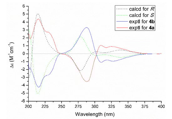 Experimental and calculated ECD spectra of 4a and 4b.