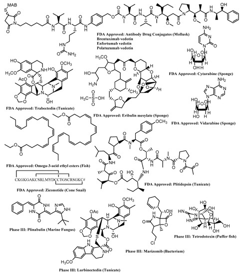 Food and Drug Administration (FDA)-approved and Phase III clinical drug candidates derived from marine natural products.