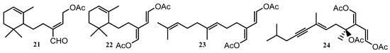 Sesquiterpenes (C-15) are found in a smaller number of Caulerpa species as diterpenes but have only been found within the genus Caulerpa for the reported green algae of Port Phillip Bay. Sesquiterpenes, with acetoxy and aldehyde functionalities (21–24), Figure 3, have been shown to be potent feeding deterrents and in some cases cytotoxic towards predatory species of herbivorous fish [29]. It has been suggested that caulerpenyne (24), an acyclic acetylenic sesquiterpene found in C. trifaria, as a minor secondary metabolite and in C. taxifolia, as a major secondary metabolite, is a key player in the cytotoxicity of Caulerpa algae towards herbivores [30].