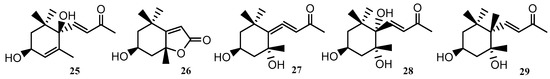 All cyclic geranylacetone compounds (25–29), Figure 4, that have been characterized were isolated from the ethyl acetate fraction of the green alga Ulva lactuca. Compounds of a similar structure type, namely, the apocarotenoids, have been studied for their potential germination and growth inhibition qualities [32,33]. Many similar types of C13 nor isoprenoids have been found largely in wine, particularly Rieslings. Many of these compounds have been isolated and studied for their floral aromas [34,35]. A distribution of the terpene compounds reported in this review by species and locality is shown in Table 2.