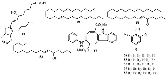 Within the reported green algae of Port Phillip Bay, a number of miscellaneous compounds were found that include some lipids (49–52), bromophenolics (54–58) and a pigment (53), Figure 5. The di-indolo pigment caulerpin (53) was found exclusively within algae of the genus Caulerpa (trifaria, brownii, flexilis, racemosa and peltata), perhaps offering a useful chemotaxonomic marker for this genus [50]. The unprecedented bicyclic lipid dictyosphaerin (49) was isolated from the endemic Australian alga Dictyosphaeria sericea. This appears to be the only natural product reported in the literature for this species and is the only genus of reported Port Phillip Bay green algae outside of Caulerpa and Ulva that has shown the presence of lipidic compounds.