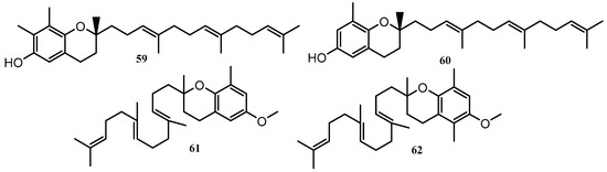 A part of the vitamin E family, the tocotrienols are a class of terpenoids that are characterized by their unsaturated farnesyl tails attached to a chromane ring, with variations between the types being expressed through substitutions on the aromatic ring or methylation of the hydroxyl group. There are four variations of the tocotrienol (α, β, γ and δ), two of the variants, γ (59) and δ (60), are reported herein. Two methylated variants of the tocotrienol compound class (61 and 62), Figure 6, were also reported here but the identity of compound 62 was not confirmed, as the location of the methyl groups on the chromane ring was unclear. This could mean that the structure of 62 could be either β-tocotrienol or γ-tocotrienol [55]. All tocotrienols were found within the genus Cystophora, δ-tocotrienol (60) appeared to be the most prolific type being isolated as a secondary metabolite in Cystophora subfarcinata, Cystophora platylobium, Cystophora monilifera, Cystophora siliquosa and Cystophora retorta [55,56,57,58]. Both γ-tocotrienol and δ-tocotrienol have been reported to display a broad range anti-cancer activity including against colon carcinoma and lung cancer [57].