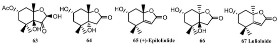 Only five monoterpenes (C-10) were isolated from the brown algae listed in this review; in this instance, compounds 63–67, Figure 7, were all derived from the edible alga Undaria pinnatifida. All monoterpenes are in the form of loliolide derivatives, differing only in the stereochemistry of a tertiary alcohol and methyl group along with the degree of unsaturation. Loliolide monoterpenes have been well studied for their biological activities [59]. Compound 65, (+)-epiloliolide, was isolated from the brown alga Sargassum naozhouense and showed moderate antioxidant activity scavenging 1, 1-diphenyl-2-picrylhydrazyl (DPPH) free radicals. Further, epiloliolide proved to have anti-microbial properties as well as displaying resistance to the fungus Candida albicans and the two bacterial strains Escherichia coli and the methicillin-resistant Staphylococcus aureus (MRSA) [60]. More recently, loliolide (67) was reported to display allelopathic influence on the germination of surrounding plant seeds, which could be a contributor to the relative competitiveness of the brown alga U. pinnatifida [61].
