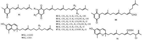 Interestingly, compounds 89–91 appear to all be derivatives of δ-tocotrienol with carboxylic acid, aldehyde or halogen functionalities. Compound 81, technically a meromonoterpene, was isolated from the acetone extract of the plant Cystophora torulosa via Sephadex LH-20 size exclusion chromatography. As this is the first meromonoterpenoid isolated from C. torulosa, it was suggested that it be a candidate for assessing phylogenic relationships of the Cystophora genus [58].