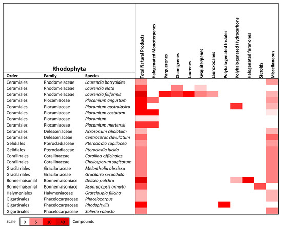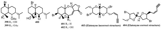 - Rochfort, S.J.; Capon, R.J. Parguerenes revisited: New brominated diterpenes from the Southern Australian marine red alga Laurencia filifromis. Aust. J. Chem. 1996, 49, 19–26. [Google Scholar] [CrossRef]