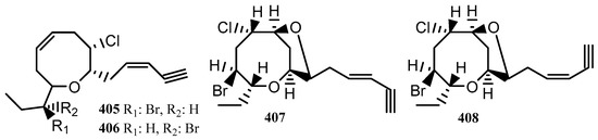 Investigations of the parguerenes as secondary metabolites have revealed the presence of at least two substructure classes; deoxyparguerenes (366–371) and parguerenes (372, 373) together with the isolation of a potential biosynthetic intermediate to the parguerenes (374) [127,128]. All compounds reported herein have been isolated from the red alga Laurencia filiformis, but this compound class has also been found in the sea hare Aplysia dactylomela. The parguerenes have been reported to have highly cytotoxic properties, and as a class have been studied on a structure activity basis. Studies such as these have shown that the cytotoxicity of parguerene compounds is dependent upon the presence of acetoxy groups at the C-2 position and bromine at the C-15 position. This is evident in the high growth inhibition activity of 367 against P388 and HeLa cell types, achieving IC50 values of 8.5 and 6.3 μg/mL, respectively [129]. In a separate study, this compound was also shown to act as a potent feeding deterrent against the abalone Haliotis discus hannai and the young sea urchins Strongylocentrotus nudus and Strongylocentrotus intermedius [130]. Compound 366, which contains the C-2 acetoxy and C-15 bromine motif, also showed moderate cytotoxicity towards Ehrlich carcinoma. More impressive though, was this compound’s ability to act as an anthelmintic agent, taking only 30 mins at a concentration of 10% w/v to achieve paralysis of the worm species Allolobophora caliginosa, whereas the standard drug mebendazole takes 4 hours to achieve the same result [131]. Furthermore, both compounds 366 and 367 have been studied for their ability to act as P-glycoprotein inhibitors, indicating potentially significant applications in chemotherapeutic treatment, specifically against multidrug resistant cancers [128]. A summary of the parguerenes isolated from red algae is given in Supporting Information (Figure S23).