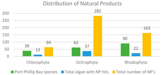 In order to explore the potential of the Port Phillip Bay region as a continuing source for bioactive marine natural products, it is important to review and document the natural products that have been studied and the bioactivities that have been discovered for the marine algae occurring in this region. The methodology adopted to compile this review required that a species list for Port Phillip Bay macroalgae to be created using the Victorian Biodiversity Atlas in conjunction with the Melbourne Museum listings for algae species found within the Port Phillip Bay area [21,22,23]. Table 1 displays the listings of the species of Port Phillip Bay algae that this review focuses upon. A number of these species are not endemic to Port Phillip Bay, and have been sampled worldwide. Thus, this review will not be limited to natural products derived only from marine algae sampled from Port Phillip Bay, but will focus on the global study of natural products from each marine algae species that exists within the Port Phillip Bay region.